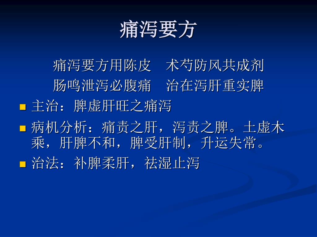 痛泻要方 痛泻要方用陈皮 术芍防风共成剂 肠鸣泄泻必腹痛 治在泻肝重实脾 • 主治:脾虚肝旺之痛泻 • 病机分析:痛责之肝,泻责之脾。土虚木乘,肝脾不和,脾受肝制,升运失常。 • 治法:补脾柔肝,祛湿止泻