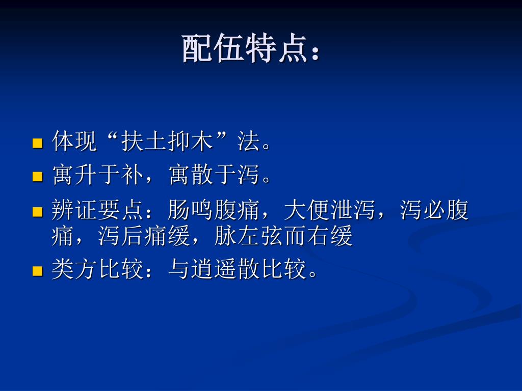 配伍特点: • 体现“扶土抑木”法。 • 寓升于补,寓散于泻。 • 辨证要点:肠鸣腹痛,大便泄泻,泻必腹痛,泻后痛缓,脉左弦而右缓 • 类方比较:与逍遥散比较。