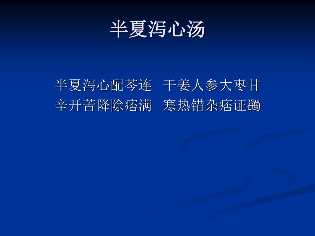 半夏泻心汤 半夏泻心配芩连 干姜人参大枣甘 辛开苦降除痞满 寒热错杂痞证蠲