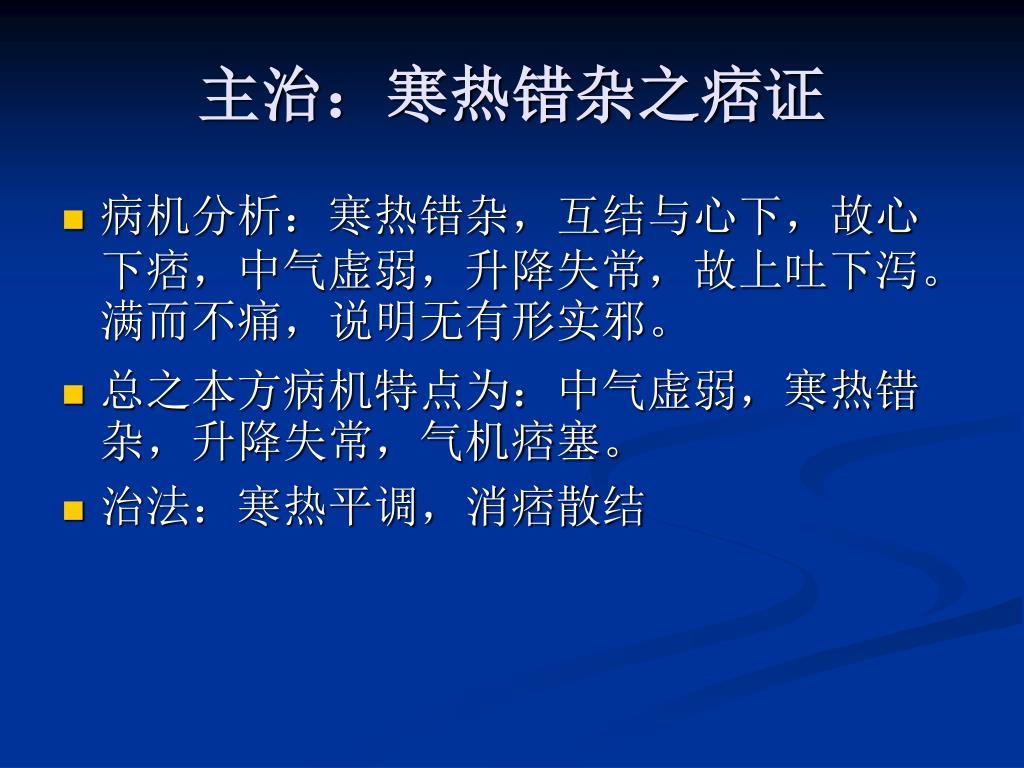 主治:寒热错杂之痞证 • 病机分析:寒热错杂,互结与心下,故心下痞,中气虚弱,升降失常,故上吐下泻。满而不痛,说明无有形实邪。 • 总之本方病机特点为:中气虚弱,寒热错杂,升降失常,气机痞塞。 • 治法:寒热平调,消痞散结