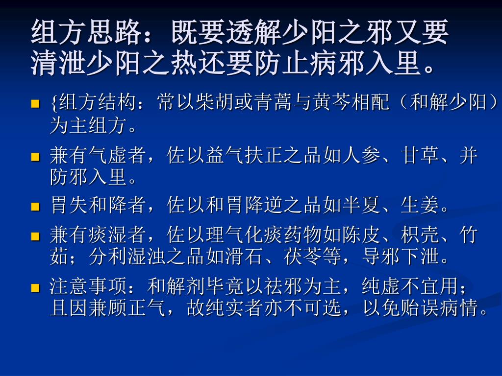 组方思路:既要透解少阳之邪又要清泄少阳之热还要防止病邪入里。组方思路:既要透解少阳之邪又要清泄少阳之热还要防止病邪入里。 • {组方结构:常以柴胡或青蒿与黄芩相配(和解少阳)为主组方。 • 兼有气虚者,佐以益气扶正之品如人参、甘草、并防邪入里。 • 胃失和降者,佐以和胃降逆之品如半夏、生姜。 • 兼有痰湿者,佐以理气化痰药物如陈皮、枳壳、竹茹;分利湿浊之品如滑石、茯苓等,导邪下泄。 • 注意事项:和解剂毕竟以祛邪为主,纯虚不宜用;且因兼顾正气,故纯实者亦不可选,以免贻误病情。