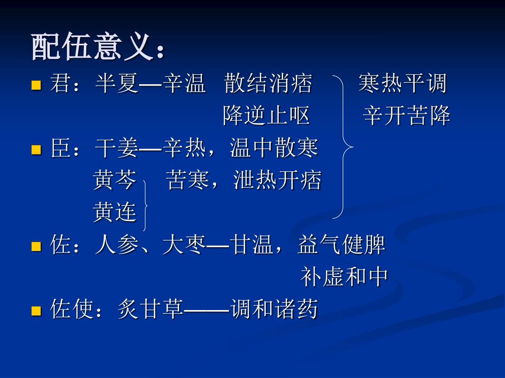配伍意义: • 君:半夏—辛温 散结消痞 寒热平调 降逆止呕 辛开苦降 • 臣:干姜—辛热,温中散寒 黄芩 苦寒,泄热开痞 黄连 • 佐:人参、大枣—甘温,益气健脾 补虚和中 • 佐使:炙甘草——调和诸药