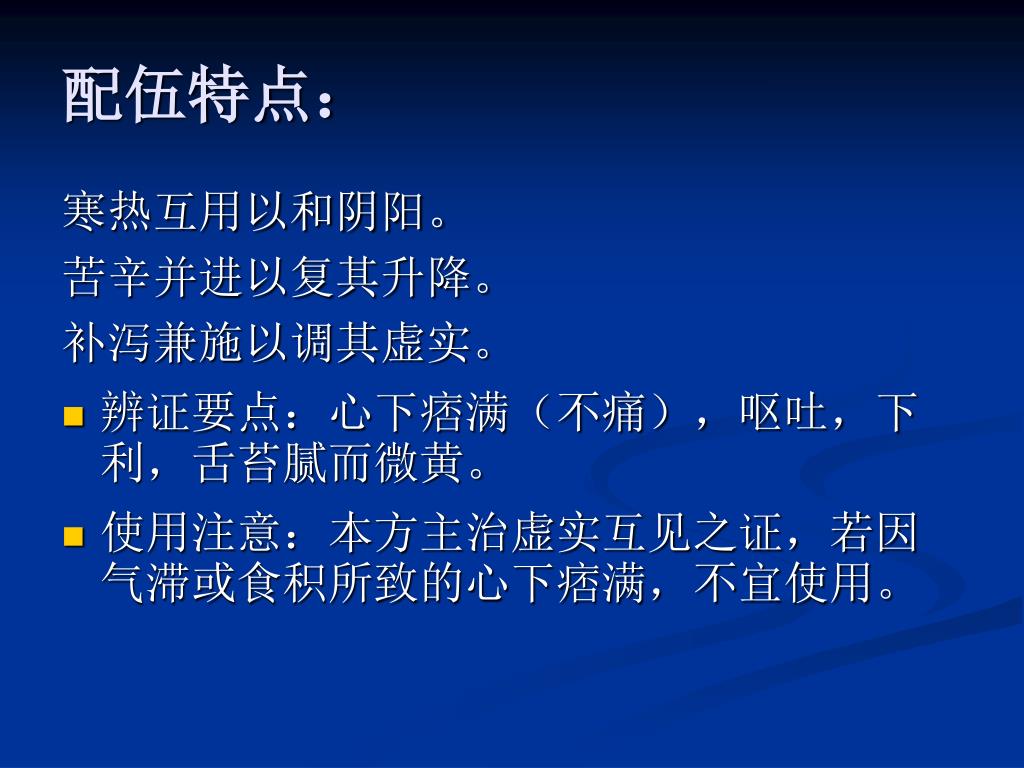 配伍特点: 寒热互用以和阴阳。 苦辛并进以复其升降。 补泻兼施以调其虚实。 • 辨证要点:心下痞满(不痛),呕吐,下利,舌苔腻而微黄。 • 使用注意:本方主治虚实互见之证,若因气滞或食积所致的心下痞满,不宜使用。