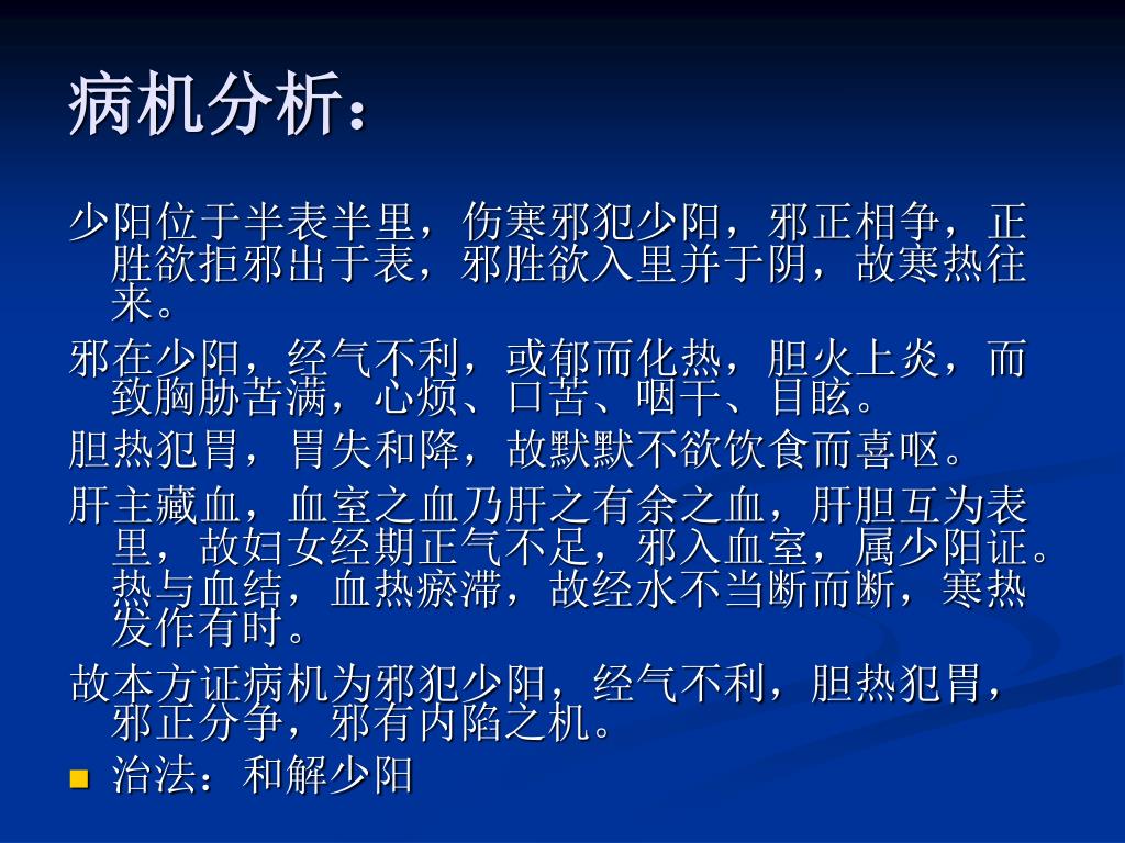 病机分析: 少阳位于半表半里,伤寒邪犯少阳,邪正相争,正胜欲拒邪出于表,邪胜欲入里并于阴,故寒热往来。 邪在少阳,经气不利,或郁而化热,胆火上炎,而致胸胁苦满,心烦、口苦、咽干、目眩。 胆热犯胃,胃失和降,故默默不欲饮食而喜呕。 肝主藏血,血室之血乃肝之有余之血,肝胆互为表里,故妇女经期正气不足,邪入血室,属少阳证。热与血结,血热瘀滞,故经水不当断而断,寒热发作有时。 故本方证病机为邪犯少阳,经气不利,胆热犯胃,邪正分争,邪有内陷之机。 • 治法:和解少阳