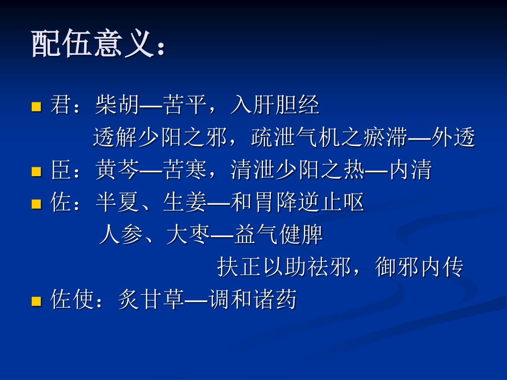 配伍意义: • 君:柴胡—苦平,入肝胆经 透解少阳之邪,疏泄气机之瘀滞—外透 • 臣:黄芩—苦寒,清泄少阳之热—内清 • 佐:半夏、生姜—和胃降逆止呕 人参、大枣—益气健脾 扶正以助祛邪,御邪内传 • 佐使:炙甘草—调和诸药