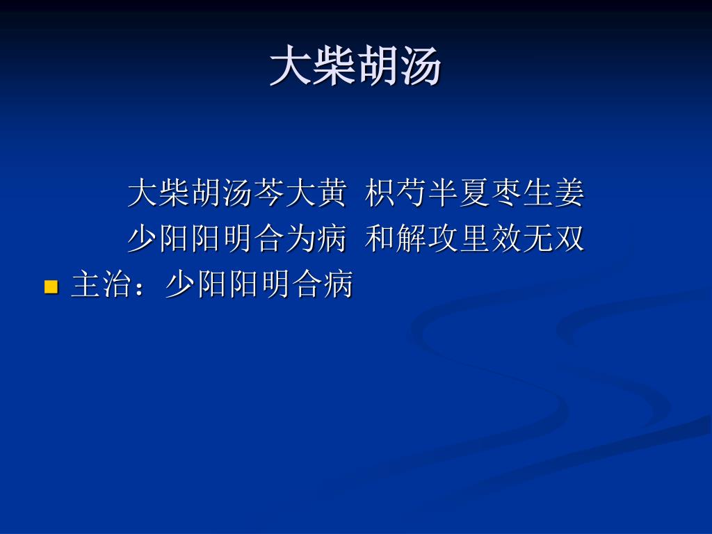 大柴胡汤 大柴胡汤芩大黄 枳芍半夏枣生姜 少阳阳明合为病 和解攻里效无双 • 主治:少阳阳明合病