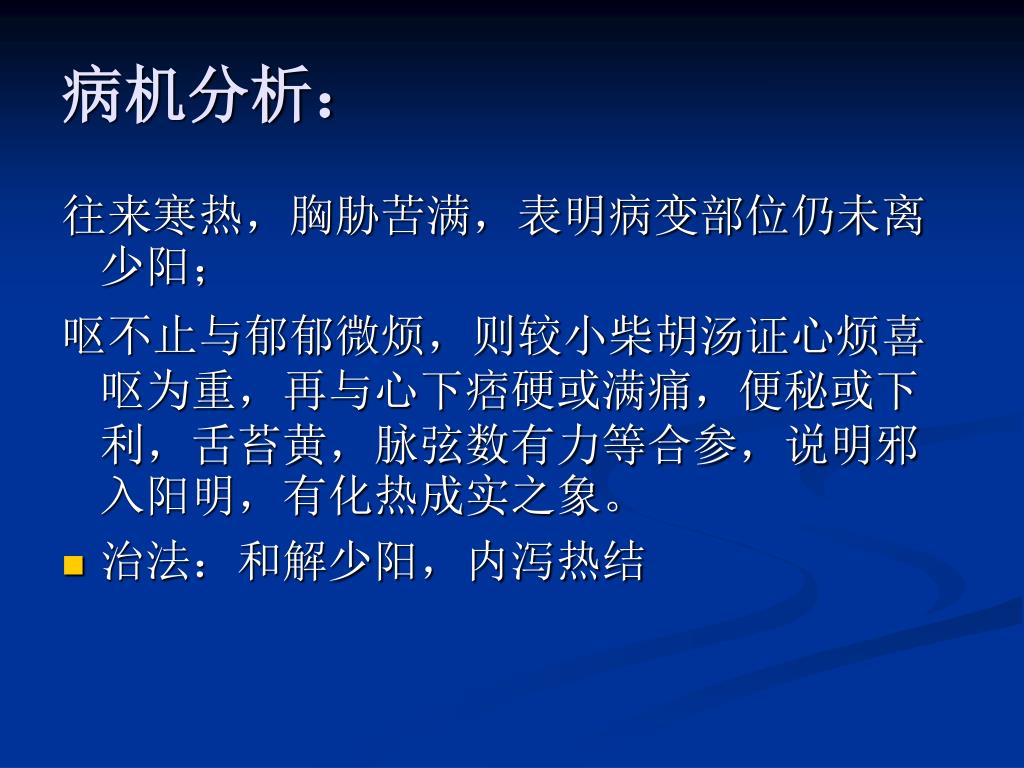 病机分析: 往来寒热,胸胁苦满,表明病变部位仍未离少阳; 呕不止与郁郁微烦,则较小柴胡汤证心烦喜呕为重,再与心下痞硬或满痛,便秘或下利,舌苔黄,脉弦数有力等合参,说明邪入阳明,有化热成实之象。 • 治法:和解少阳,内泻热结
