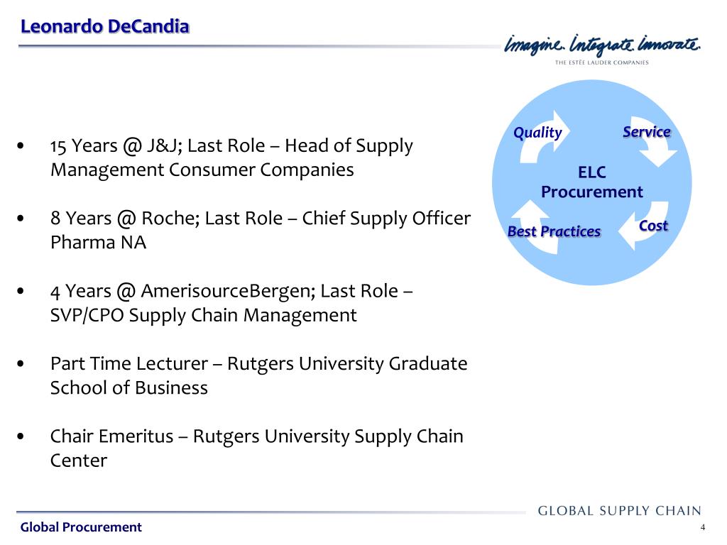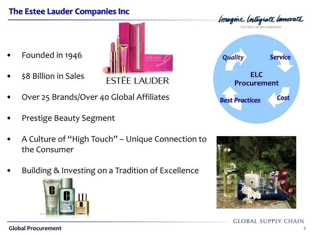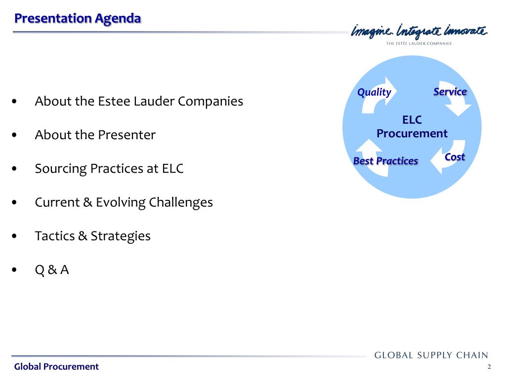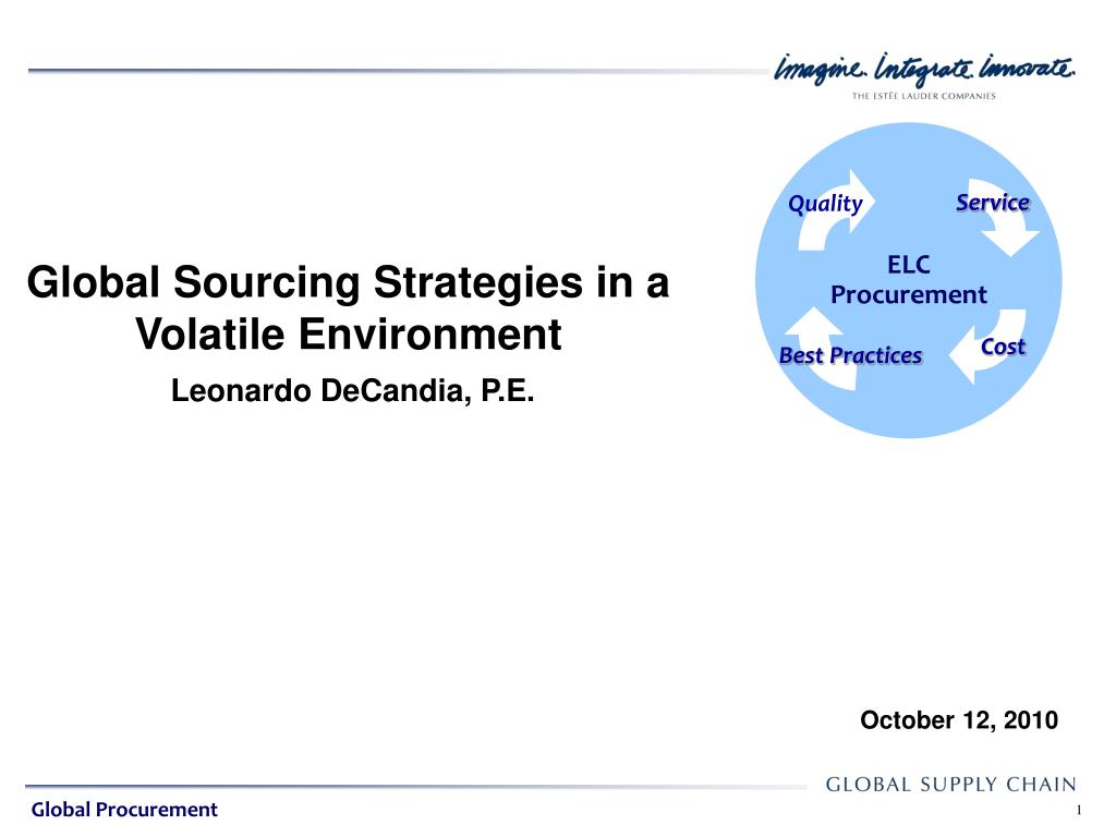 ELC Procurement. Service. Quality. Global Sourcing Strategies in a Volatile Environment Leonardo DeCandia, P.E. Cost. Best Practices. October 12, 2010. Global Procurement. Presentation Agenda. ELC Procurement. Service. Quality. About the Estee Lauder Companies
