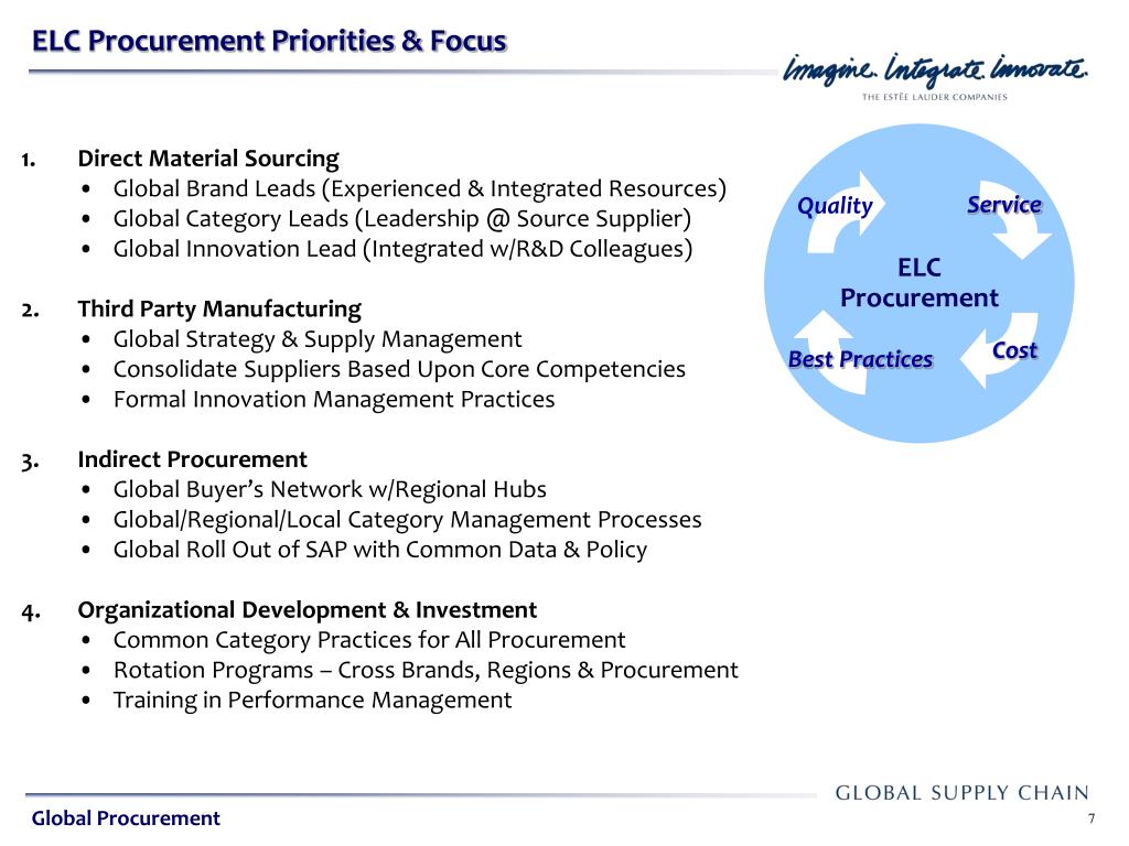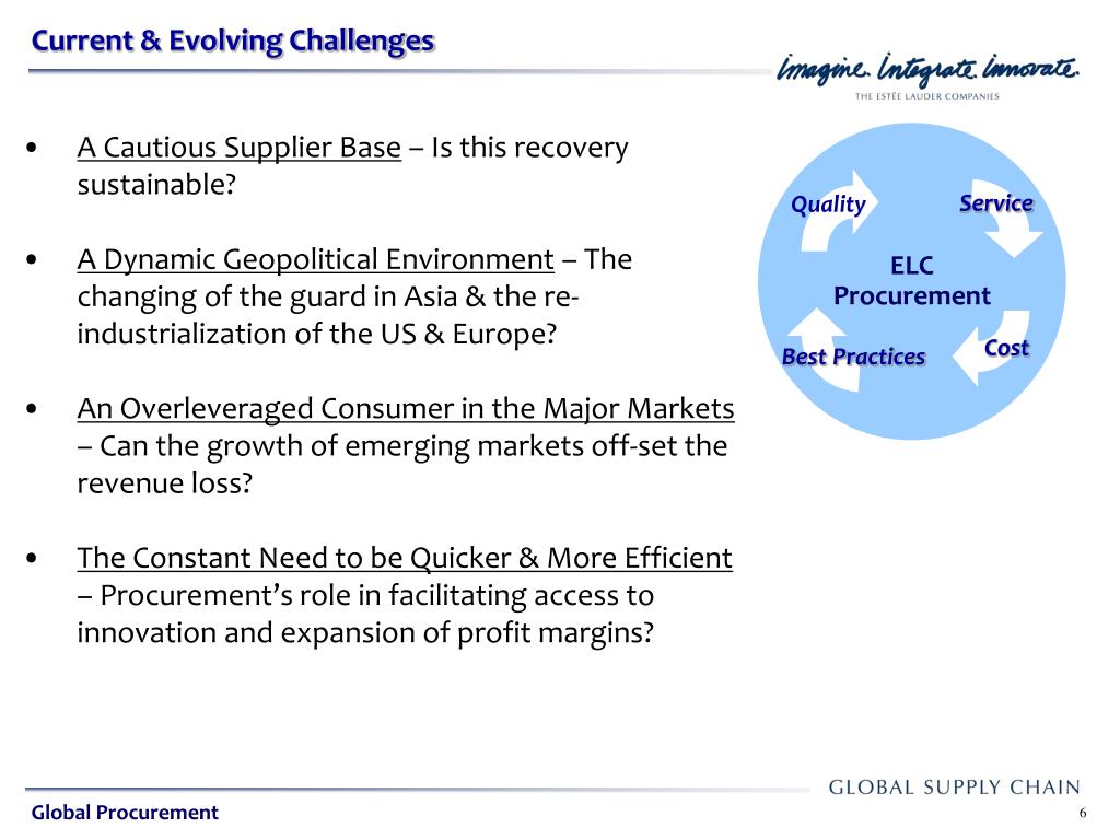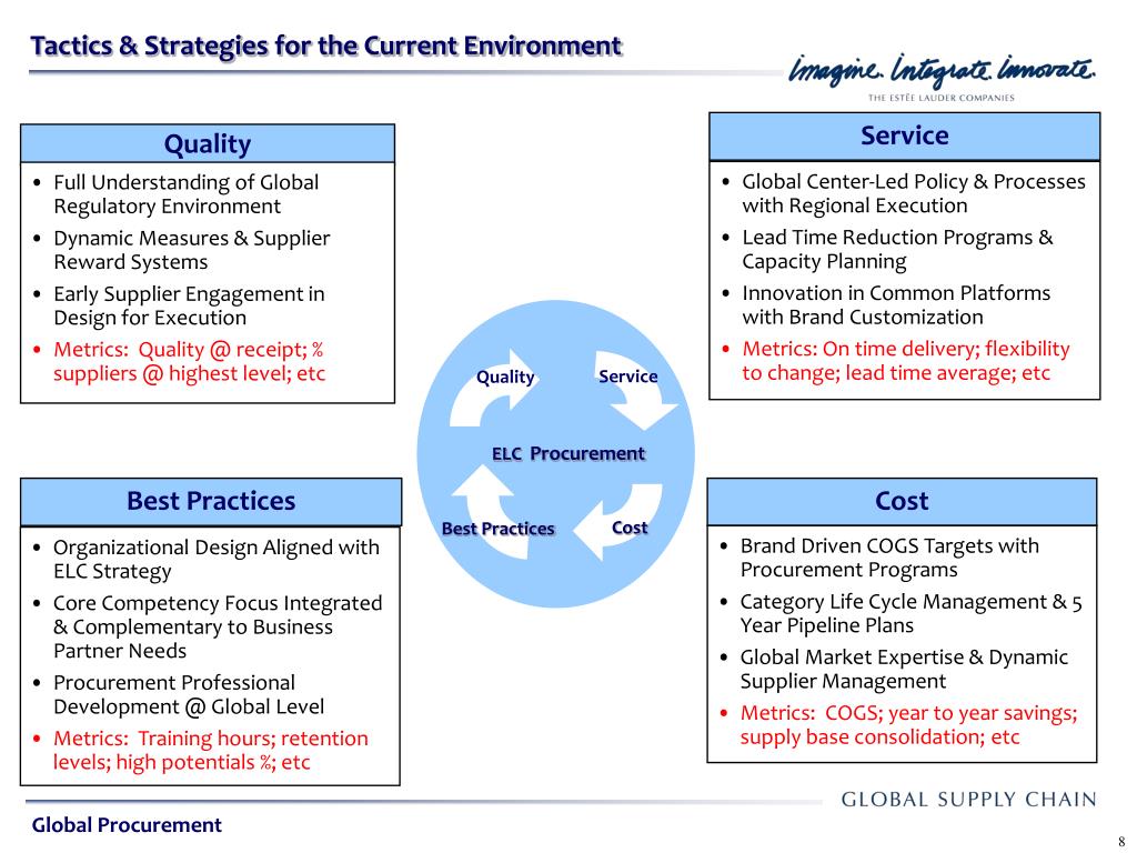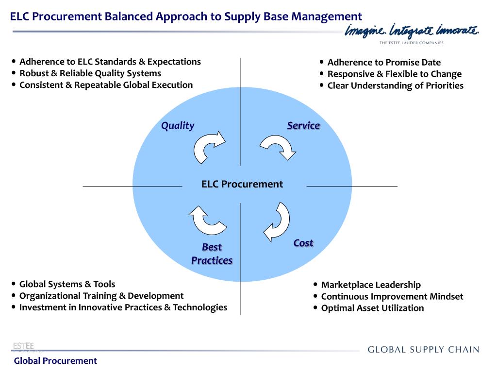 ELC Procurement. Service. Quality. Global Sourcing Strategies in a Volatile Environment Leonardo DeCandia, P.E. Cost. Best Practices. October 12, 2010. Global Procurement. Presentation Agenda. ELC Procurement. Service. Quality. About the Estee Lauder Companies