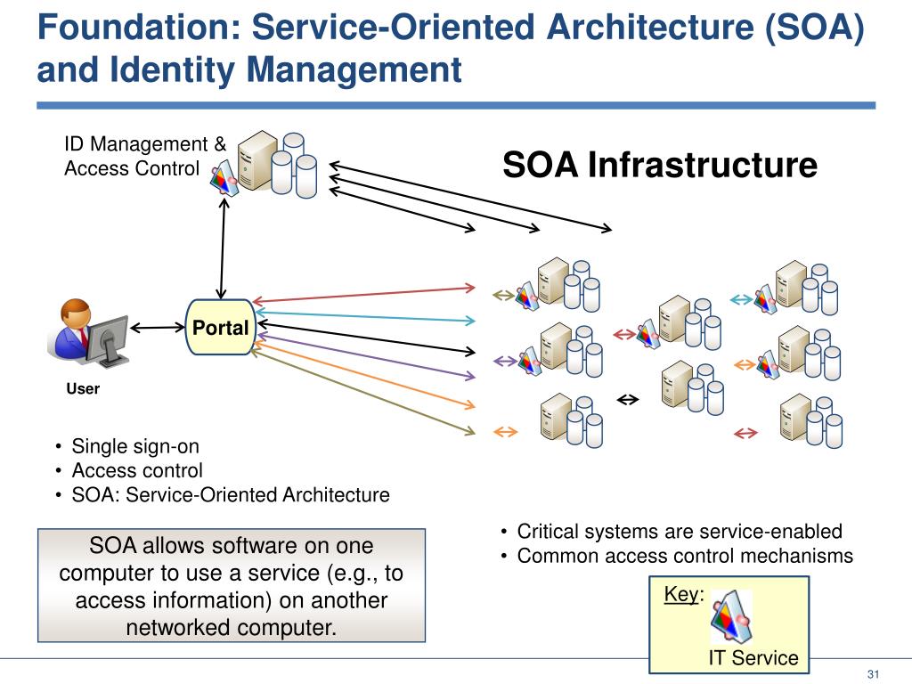 Foundation: Service-Oriented Architecture (SOA) and Identity Management Key: IT Service ID Management &Access Control SOA Infrastructure Portal User • Single sign-on • Access control • SOA: Service-Oriented Architecture • Critical systems are service-enabled • Common access control mechanisms • SOA allows software on one computer to use a service (e.g., to access information) on another networked computer.