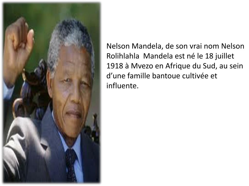 La vie de Nelson Mandela. De Carla DJOLI . Nelson Mandela, de son vrai nom Nelson Rolihlahla Mandela est né le 18 juillet 1918 à Mvezo en Afrique du Sud, au sein d’une famille bantoue cultivée et influente.