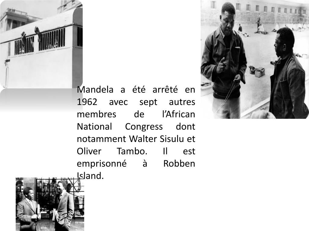 Mandela a étéarrêtéen 1962 avec sept autres membres de l’African National Congress dontnotamment Walter Sisulu et Oliver Tambo. Il estemprisonnéà Robben Island.