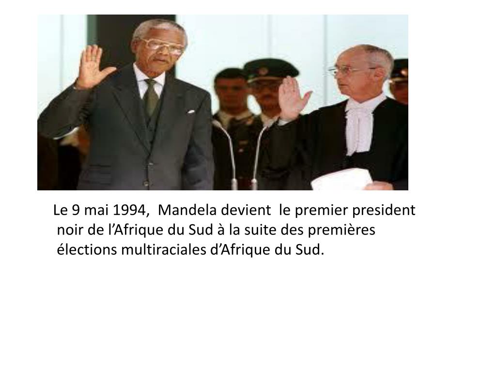 Le 9 mai 1994, Mandela devient le premier president noir de l’Afrique du Sud à la suite des premières électionsmultiracialesd’Afrique du Sud.
