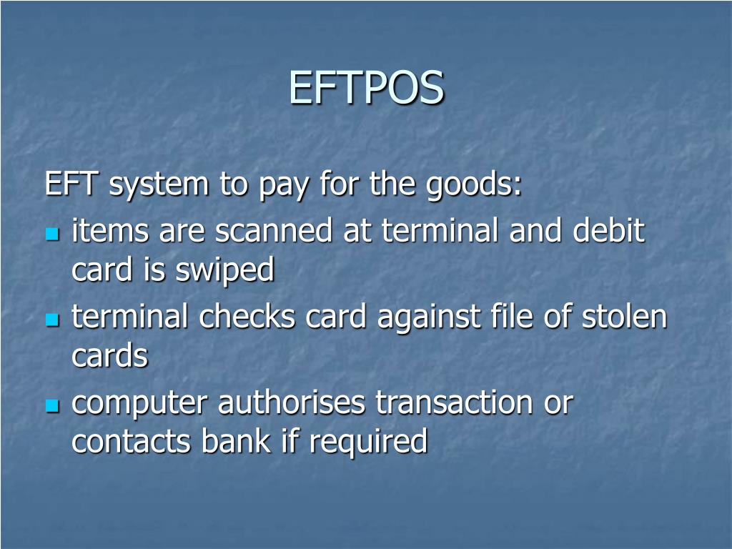 EFTPOS EFT system to pay for the goods: • items are scanned at terminal and debit card is swiped • terminal checks card against file of stolen cards • computer authorises transaction or contacts bank if required