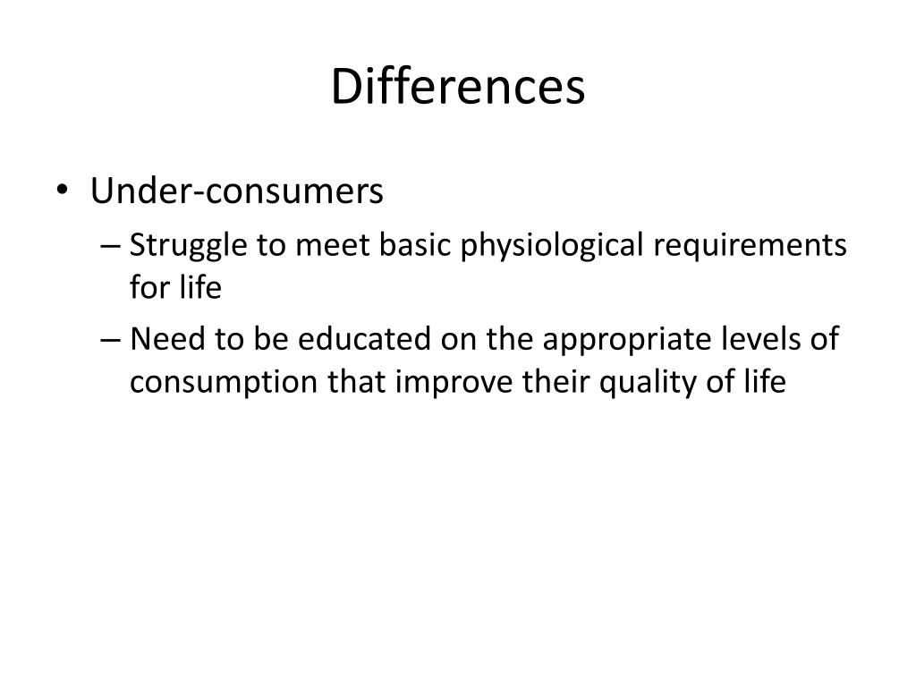 Differences • Under-consumers • Struggle to meet basic physiological requirements for life • Need to be educated on the appropriate levels of consumption that improve their quality of life