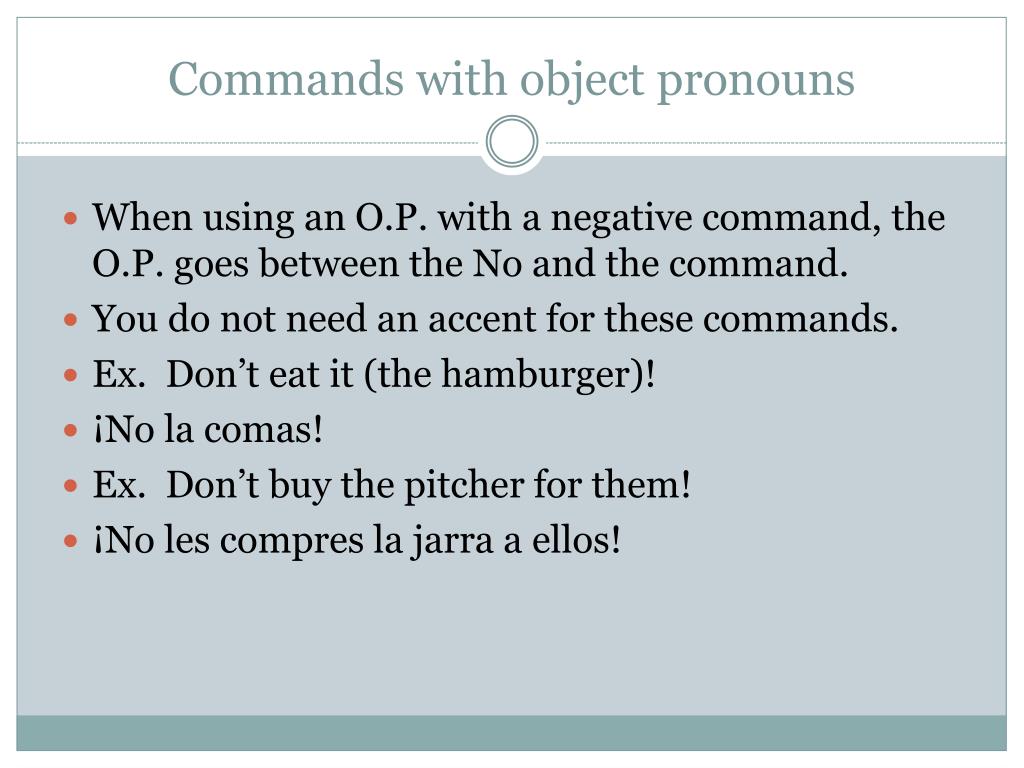 Commands with object pronouns When using an O.P. with a negative command, the O.P. goes between the No and the command. You do not need an accent for these commands. Ex. Don’t eat it (the hamburger)! ¡No la comas! Ex. Don’t buy the pitcherfor them! ¡No les compres la jarraa ellos!