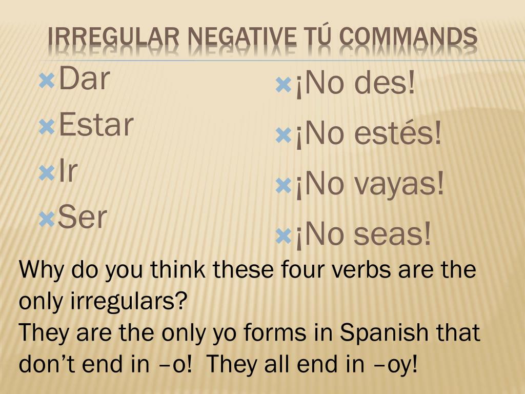 Irregular Negative Tú Commands • Dar • Estar • Ir • Ser • ¡No des! • ¡No estés! • ¡No vayas! • ¡No seas! Why do you think these four verbs are the only irregulars? They are the only yo forms in Spanish that don’t end in –o! They all end in –oy!
