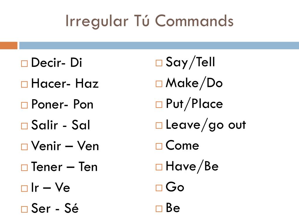 Irregular Tú Commands • Decir- Di • Hacer- Haz • Poner- Pon • Salir - Sal • Venir – Ven • Tener – Ten • Ir – Ve • Ser - Sé • Say/Tell • Make/Do • Put/Place • Leave/go out • Come • Have/Be • Go • Be