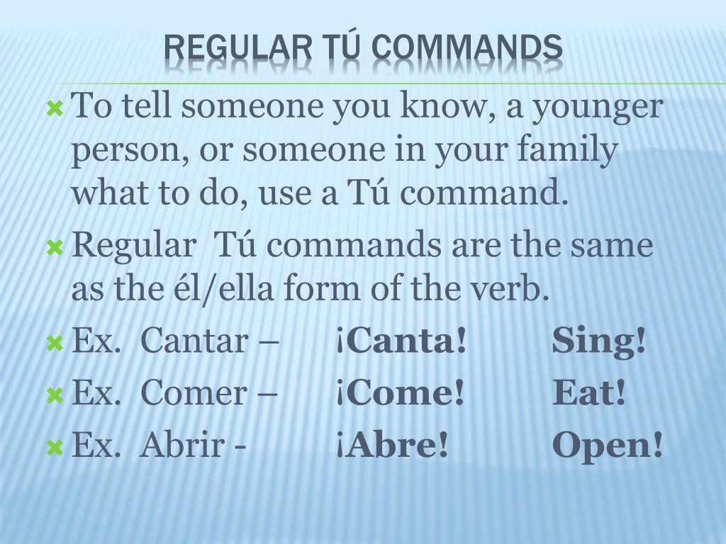 To tell someone you know, a younger person, or someone in your family what to do, use a Tú command. Regular Tú commands are the same as the él/ella form of the verb. Ex. Cantar – ¡Canta! Sing! Ex. Comer – ¡Come! Eat! Ex. Abrir - ¡Abre! Open! Regular Tú Commands