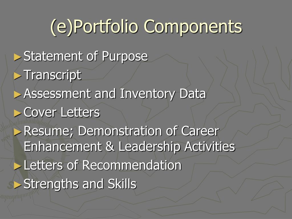 (e)Portfolio Components • Statement of Purpose • Transcript • Assessment and Inventory Data • Cover Letters • Resume; Demonstration of Career Enhancement & Leadership Activities • Letters of Recommendation • Strengths and Skills