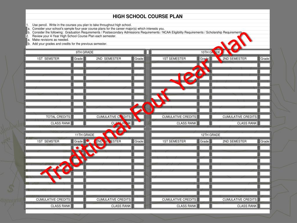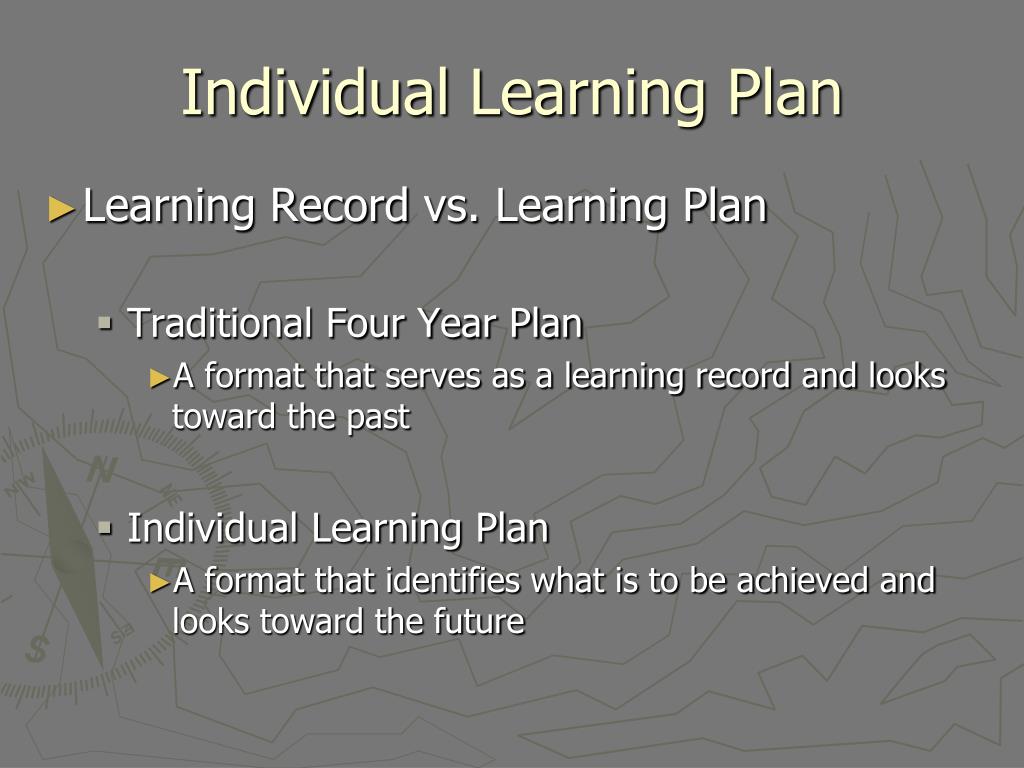Individual Learning Plan • Learning Record vs. Learning Plan • Traditional Four Year Plan • A format that serves as a learning record and looks toward the past • Individual Learning Plan • A format that identifies what is to be achieved and looks toward the future