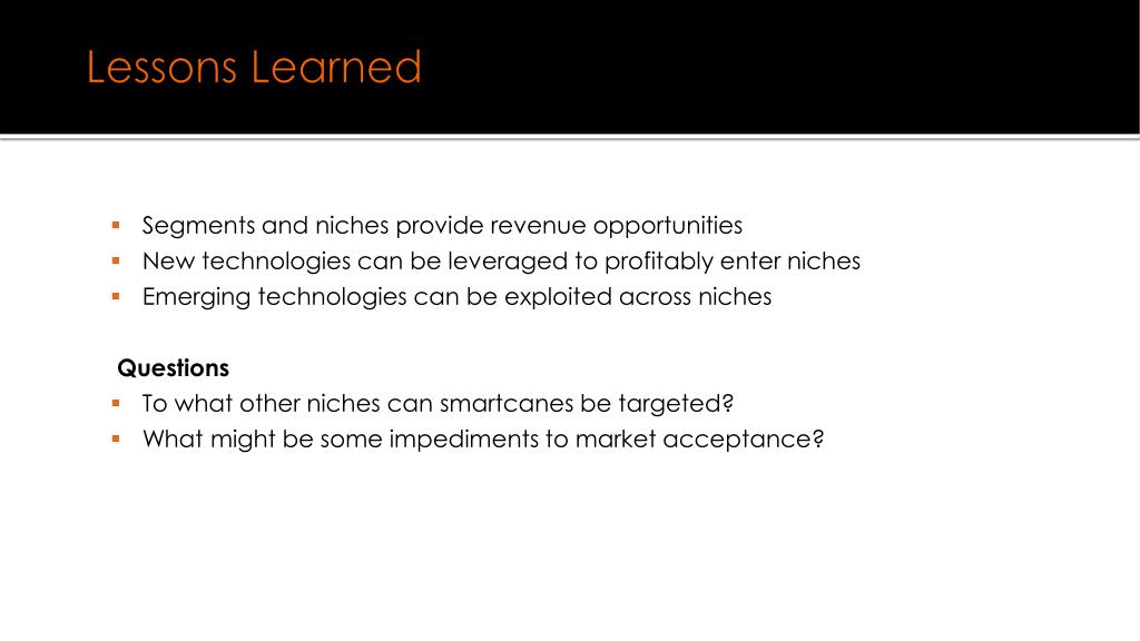 Lessons Learned • Segments and niches provide revenue opportunities • New technologies can be leveraged to profitably enter niches • Emerging technologies can be exploited across niches • Questions • To what other niches can smartcanes be targeted? • What might be some impediments to market acceptance?