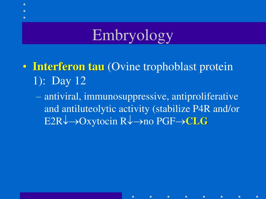 Embryology • Interferon tau(Ovine trophoblast protein 1): Day 12 • antiviral, immunosuppressive, antiproliferative and antiluteolytic activity (stabilize P4R and/or E2ROxytocin Rno PGFCLG