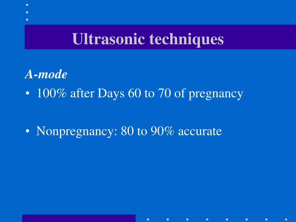 Ultrasonic techniques A-mode • 100% after Days 60 to 70 of pregnancy • Nonpregnancy: 80 to 90% accurate