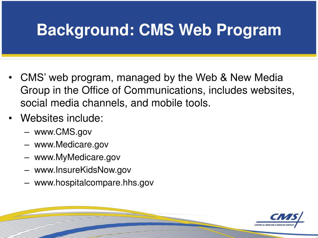 Background: CMS Web Program • CMS’ web program, managed by the Web & New Media Group in the Office of Communications, includes websites, social media channels, and mobile tools. • Websites include: • www.CMS.gov • www.Medicare.gov • www.MyMedicare.gov • www.InsureKidsNow.gov • www.hospitalcompare.hhs.gov