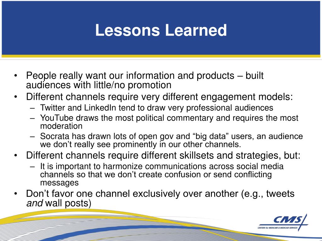 Lessons Learned • People really want our information and products – built audiences with little/no promotion • Different channels require very different engagement models: • Twitter and LinkedIn tend to draw very professional audiences • YouTube draws the most political commentary and requires the most moderation • Socrata has drawn lots of open gov and “big data” users, an audience we don’t really see prominently in our other channels. • Different channels require different skillsets and strategies, but: • It is important to harmonize communications across social media channels so that we don’t create confusion or send conflicting messages • Don’t favor one channel exclusively over another (e.g., tweets and wall posts)