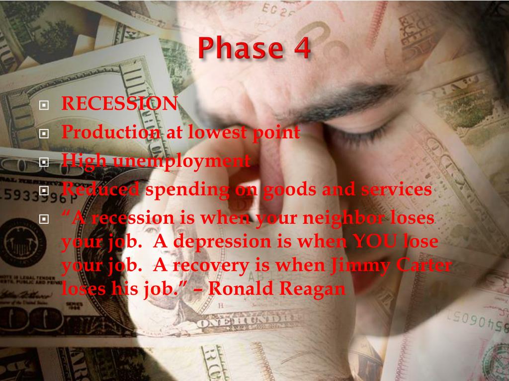 Phase 4 • RECESSION • Production at lowest point • High unemployment • Reduced spending on goods and services • “A recession is when your neighbor loses your job. A depression is when YOU lose your job. A recovery is when Jimmy Carter loses his job.” – Ronald Reagan