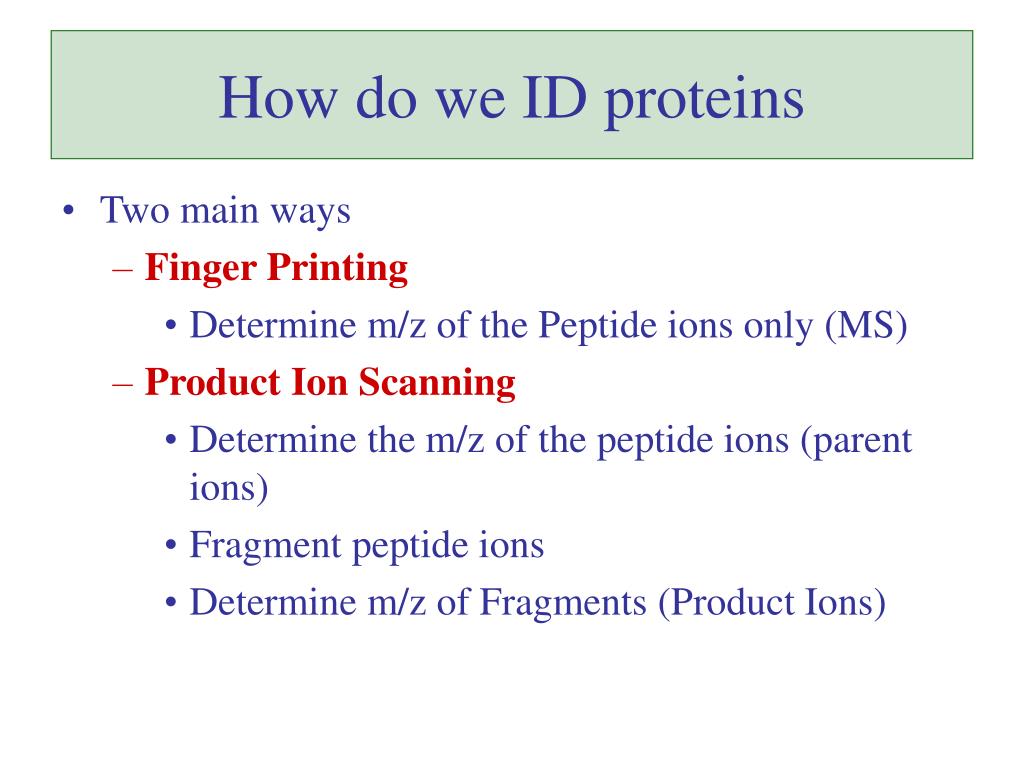 How do we ID proteins • Two main ways • Finger Printing • Determine m/z of the Peptide ions only (MS) • Product Ion Scanning • Determine the m/z of the peptide ions (parent ions) • Fragment peptide ions • Determine m/z of Fragments (Product Ions)