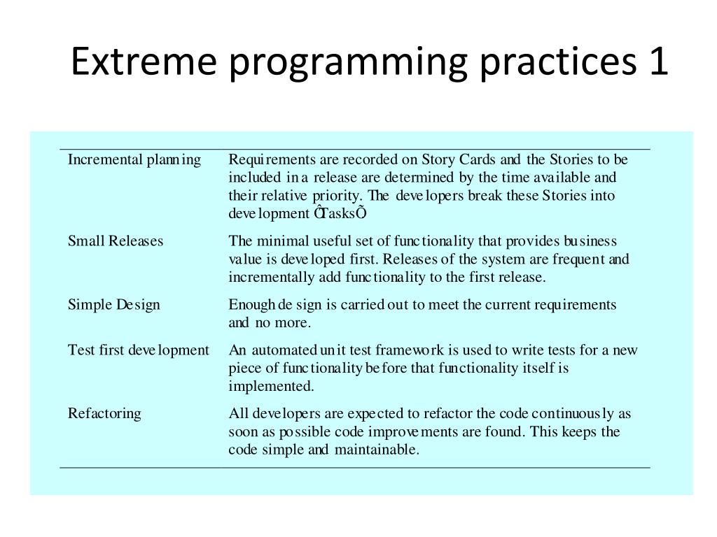 Extreme programming • Perhaps the best-known and most widely used agile method. • Extreme Programming (XP) takes an ‘extreme’ approach to iterative development. • New versions may be built several times per day; • Increments are delivered to customers every 2 weeks; • All tests must be run for every build and the build is only accepted if tests run successfully.