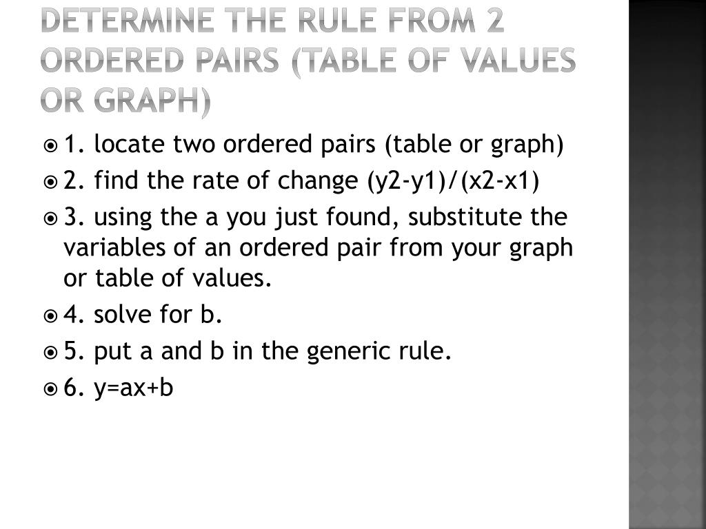 Determine the rule from 2 ordered pairs (table of values or graph) • 1. locate two ordered pairs (table or graph) • 2. find the rate of change (y2-y1)/(x2-x1) • 3. using the a you just found, substitute the variables of an ordered pair from your graph or table of values. • 4. solve for b. • 5. put a and b in the generic rule. • 6. y=ax+b