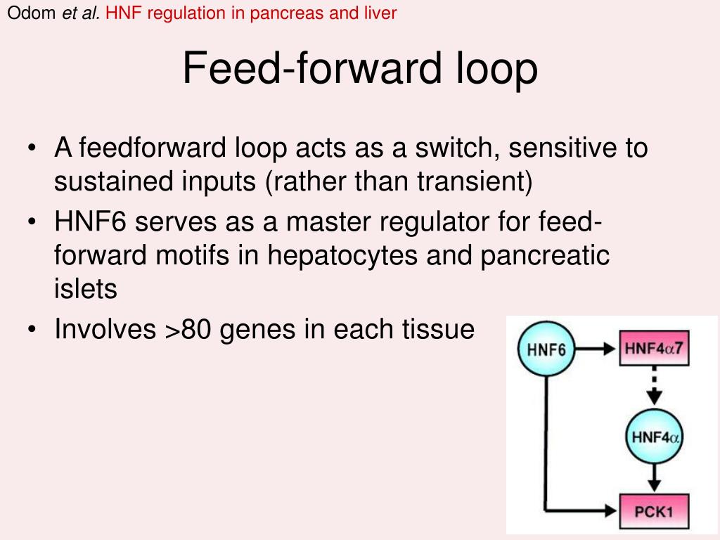 Odom et al. HNF regulation in pancreas and liver Feed-forward loop • A feedforward loop acts as a switch, sensitive to sustained inputs (rather than transient) • HNF6 serves as a master regulator for feed-forward motifs in hepatocytes and pancreatic islets • Involves >80 genes in each tissue