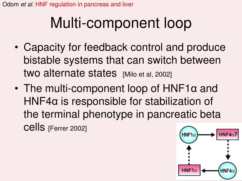 Odom et al. HNF regulation in pancreas and liver Multi-component loop • Capacity for feedback control and produce bistable systems that can switch between two alternate states [Milo et al, 2002] • The multi-component loop of HNF1α and HNF4α is responsible for stabilization of the terminal phenotype in pancreatic beta cells [Ferrer 2002]