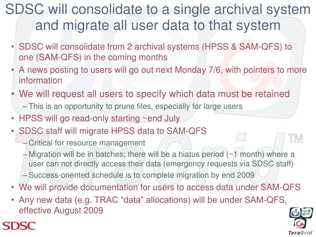 SDSC will consolidate to a single archival system and migrate all user data to that system • SDSC will consolidate from 2 archival systems (HPSS & SAM-QFS) to one (SAM-QFS) in the coming months • A news posting to users will go out next Monday 7/6, with pointers to more information • We will request all users to specify which data must be retained • This is an opportunity to prune files, especially for large users • HPSS will go read-only starting ~end July • SDSC staff will migrate HPSS data to SAM-QFS • Critical for resource management • Migration will be in batches; there will be a hiatus period (~1 month) where a user can not directly access their data (emergency requests via SDSC staff) • Success-oriented schedule is to complete migration by end 2009 • We will provide documentation for users to access data under SAM-QFS • Any new data (e.g. TRAC “data” allocations) will be under SAM-QFS, effective August 2009