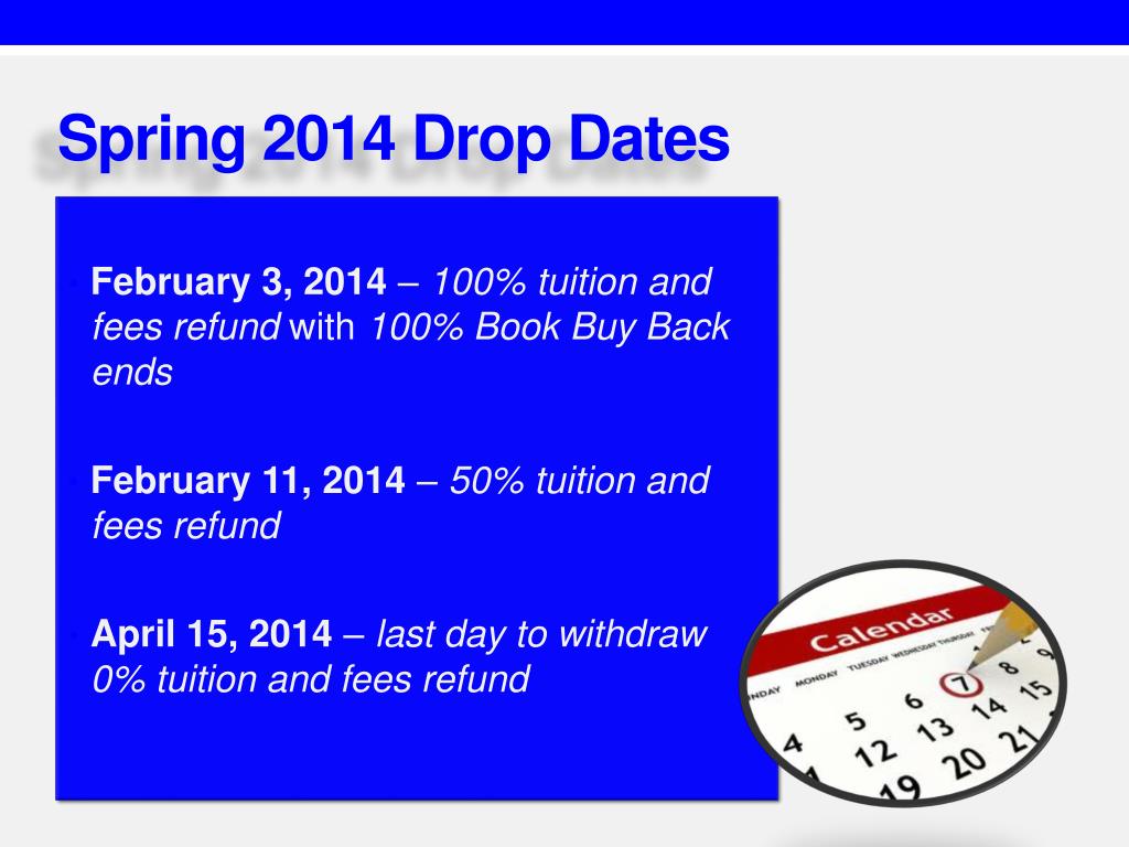 Spring 2014 Drop Dates • February 3, 2014 – 100% tuition and fees refund with 100% Book Buy Back ends • February 11, 2014 – 50% tuition and fees refund • April 15, 2014 – last day to withdraw 0% tuition and fees refund