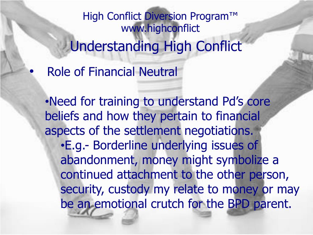 High Conflict Diversion Program™www.highconflict Understanding High Conflict • Role of Financial Neutral • Need for training to understand Pd’s core beliefs and how they pertain to financial aspects of the settlement negotiations. • E.g.- Borderline underlying issues of abandonment, money might symbolize a continued attachment to the other person, security, custody my relate to money or may be an emotional crutch for the BPD parent.