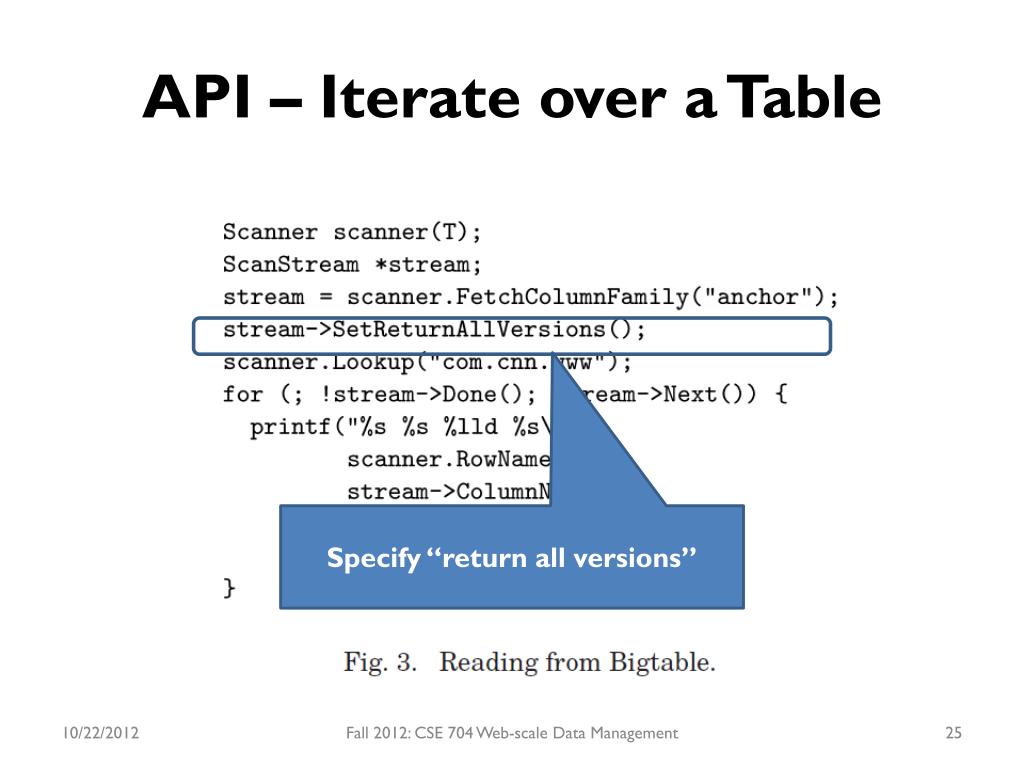 API – Iterate over a Table Specify “return all versions” Fall 2012: CSE 704 Web-scale Data Management