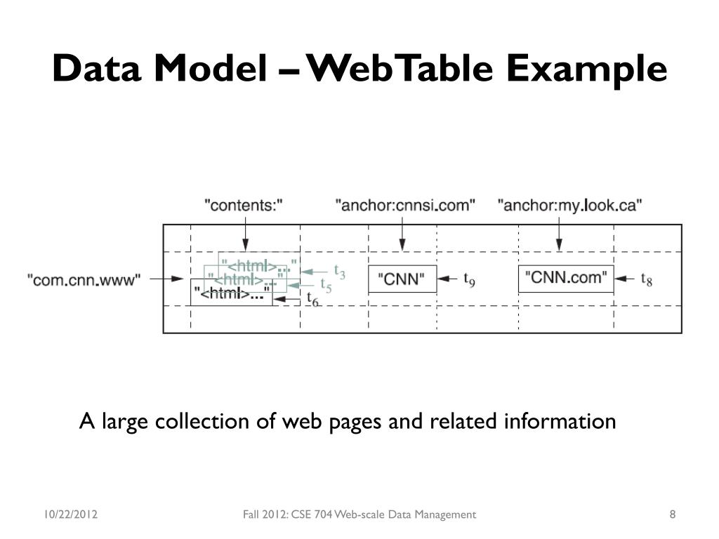 Data Model – WebTable Example A large collection of web pages and related information Fall 2012: CSE 704 Web-scale Data Management
