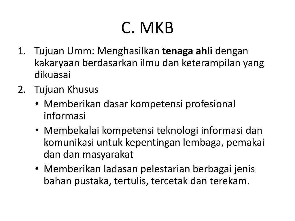 C. MKB • Tujuan Umm: Menghasilkantenagaahlidengankakaryaanberdasarkanilmudanketerampilan yang dikuasai • TujuanKhusus • Memberikandasarkompetensiprofesionalinformasi • Membekalaikompetensiteknologiinformasidankomunikasiuntukkepentinganlembaga, pemakaidandanmasyarakat • Memberikanladasanpelestarianberbagaijenisbahanpustaka, tertulis, tercetakdanterekam.