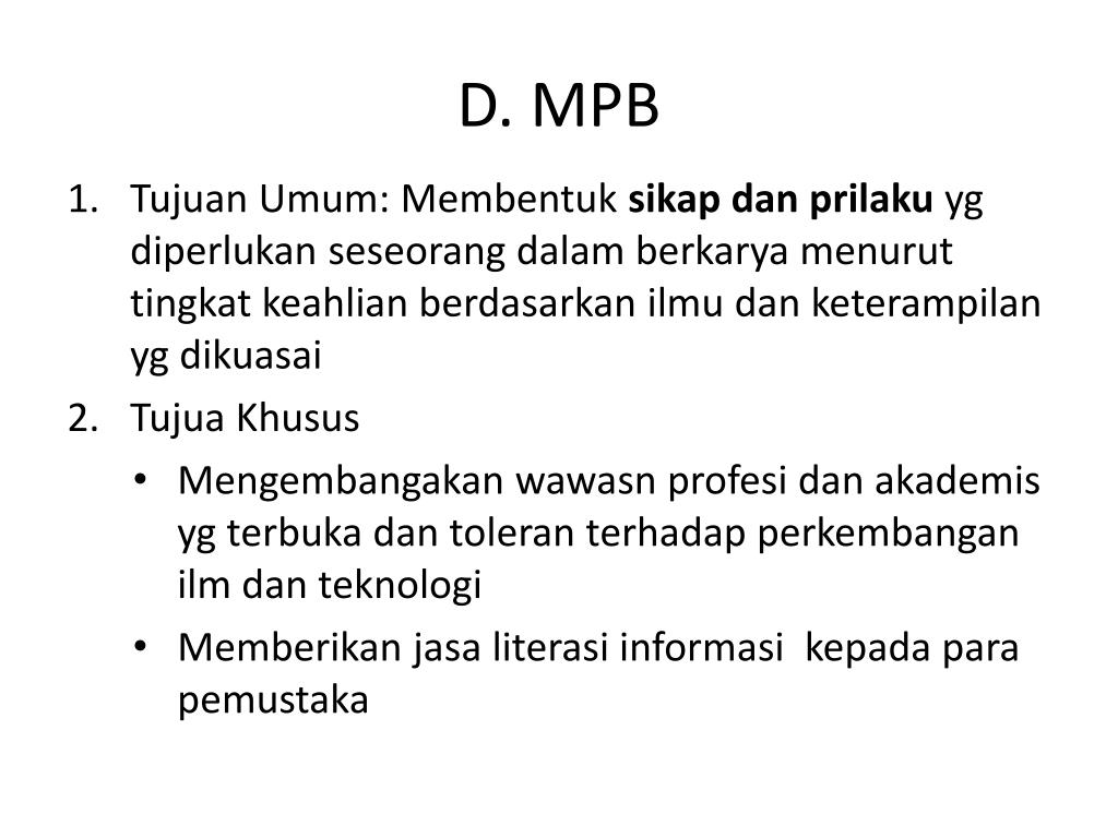 D. MPB • TujuanUmum: Membentuksikapdanprilakuygdiperlukanseseorangdalamberkaryamenuruttingkatkeahlianberdasarkanilmudanketerampilanygdikuasai • TujuaKhusus • Mengembangakanwawasnprofesidanakademisygterbukadantoleranterhadapperkembanganilmdanteknologi • Memberikanjasaliterasiinformasikepadaparapemustaka