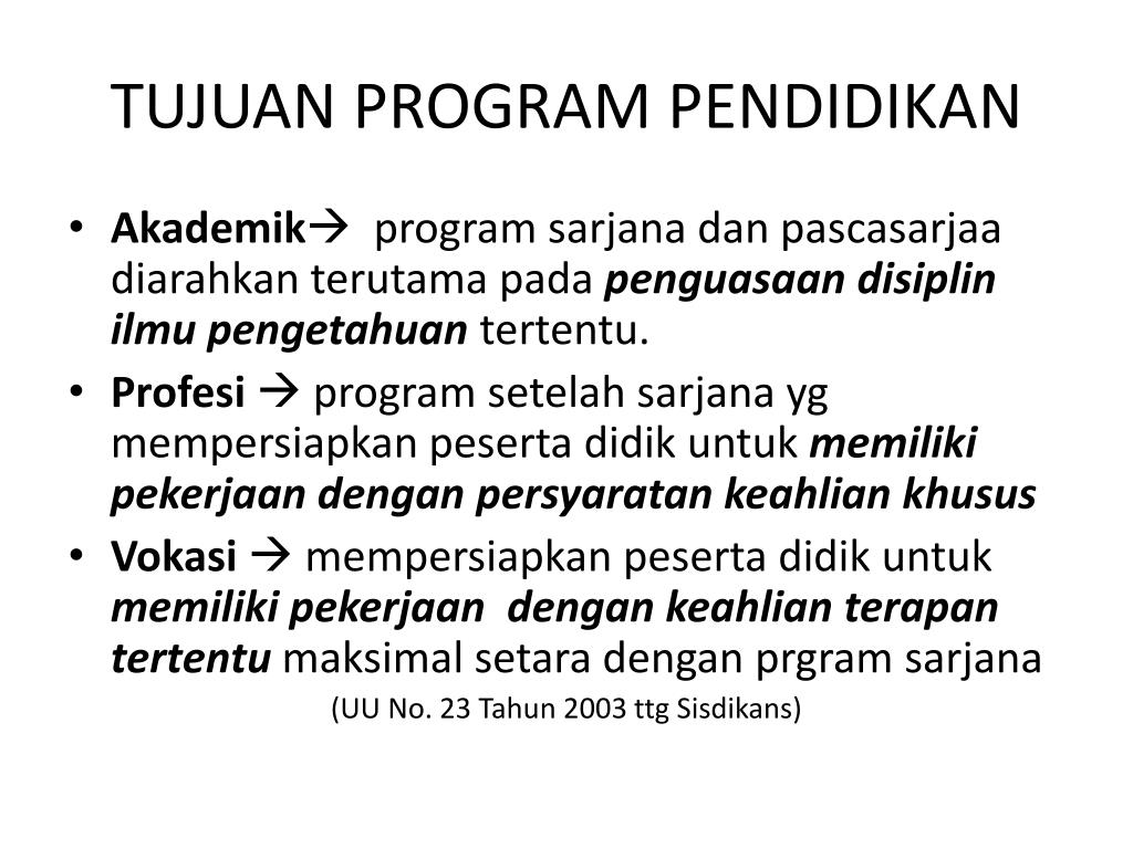TUJUAN PROGRAM PENDIDIKAN • Akademik program sarjanadanpascasarjaadiarahkanterutamapadapenguasaandisiplinilmupengetahuantertentu. • Profesi program setelahsarjanaygmempersiapkanpesertadidikuntukmemilikipekerjaandenganpersyaratankeahliankhusus • Vokasi mempersiapkanpesertadidikuntukmemilikipekerjaandengankeahlianterapantertentumaksimalsetaradenganprgramsarjana (UU No. 23 Tahun 2003 ttgSisdikans)