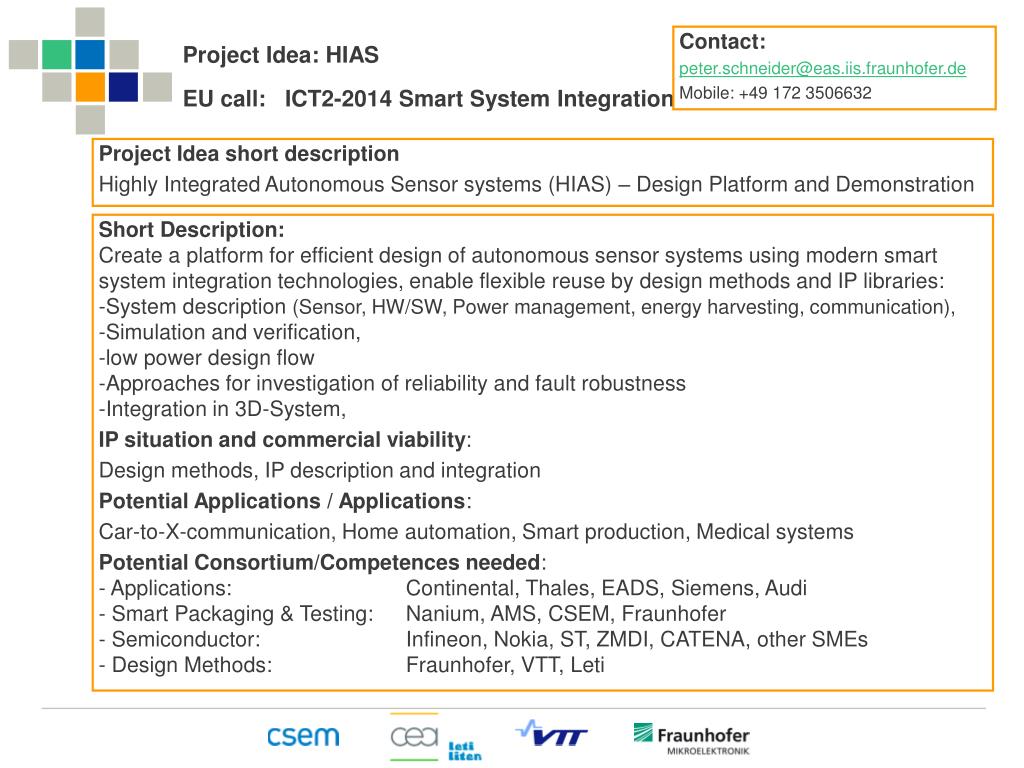 Contact: peter.schneider@eas.iis.fraunhofer.de Mobile: +49 172 3506632 Project Idea: HIASEU call: ICT2-2014 Smart System Integration Project Idea short description Highly Integrated Autonomous Sensor systems (HIAS) – Design Platform and Demonstration Short Description: Create a platform for efficient design of autonomous sensor systems using modern smart system integration technologies, enable flexible reuse by design methods and IP libraries: • System description (Sensor, HW/SW, Power management, energy harvesting, communication), • Simulation and verification, • low power design flow • Approaches for investigation of reliability and fault robustness • Integration in 3D-System, IP situation and commercial viability: Design methods, IP description and integration Potential Applications / Applications: Car-to-X-communication, Home automation, Smart production, Medical systems Potential Consortium/Competences needed: - Applications: Continental, Thales, EADS, Siemens, Audi - Smart Packaging & Testing: Nanium, AMS, CSEM, Fraunhofer - Semiconductor: Infineon, Nokia, ST, ZMDI, CATENA, other SMEs - Design Methods: Fraunhofer, VTT, Leti