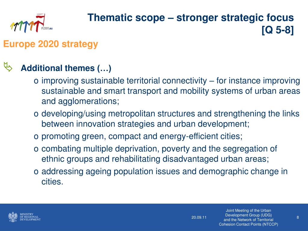 Thematic scope – stronger strategic focus [Q 5-8] Europe 2020 strategy • Additional themes (…) • improving sustainable territorial connectivity – for instance improving sustainable and smart transport and mobility systems of urban areas and agglomerations; • developing/using metropolitan structures and strengthening the links between innovation strategies and urban development; • promoting green, compact and energy-efficient cities; • combating multiple deprivation, poverty and the segregation of ethnic groups and rehabilitating disadvantaged urban areas; • addressing ageing population issues and demographic change in cities. 20.09.11 Joint Meeting of the Urban Development Group (UDG) and the Network of Territorial Cohesion Contact Points (NTCCP) 8