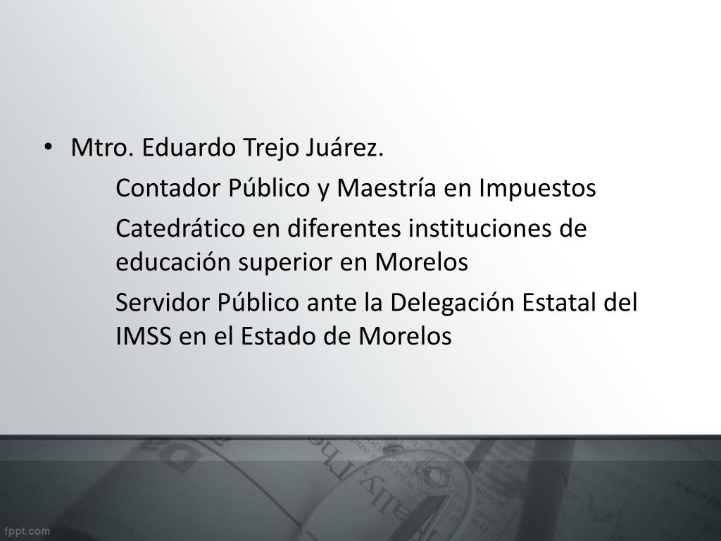 Mtro. Eduardo Trejo Juárez. Contador Público y Maestría en Impuestos Catedrático en diferentes instituciones de educación superior en Morelos Servidor Público ante la Delegación Estatal del IMSS en el Estado de Morelos