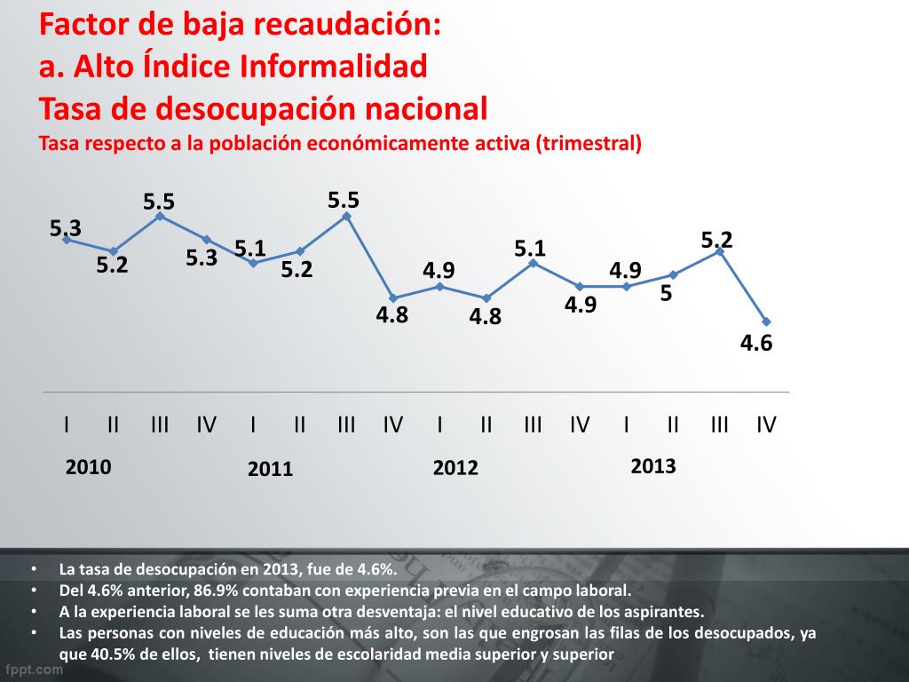 Factor de baja recaudación:a. Alto Índice InformalidadTasa de desocupación nacionalTasa respecto a la población económicamente activa (trimestral) 2013 2010 2012 2011 • La tasa de desocupación en 2013, fue de 4.6%. • Del 4.6% anterior, 86.9% contaban con experiencia previa en el campo laboral. • A la experiencia laboral se les suma otra desventaja: el nivel educativo de los aspirantes. • Las personas con niveles de educación más alto, son las que engrosan las filas de los desocupados, ya que 40.5% de ellos, tienen niveles de escolaridad media superior y superior