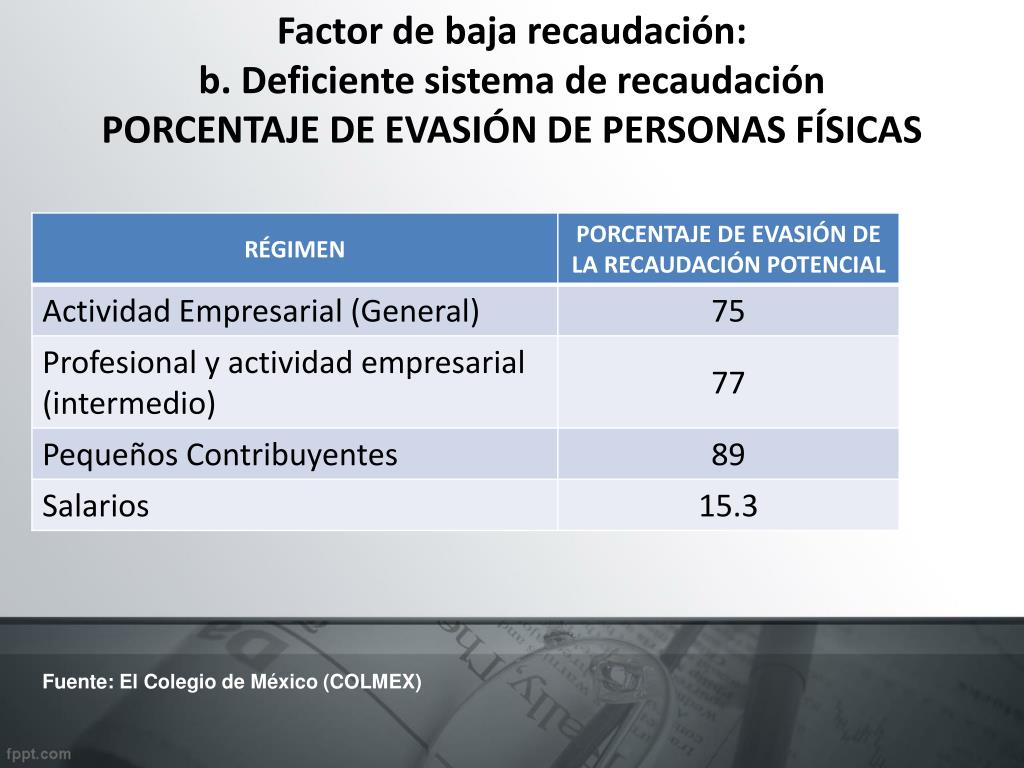 Factor de baja recaudación: b. Deficiente sistema de recaudaciónPORCENTAJE DE EVASIÓN DE PERSONAS FÍSICAS Fuente: El Colegio de México (COLMEX)