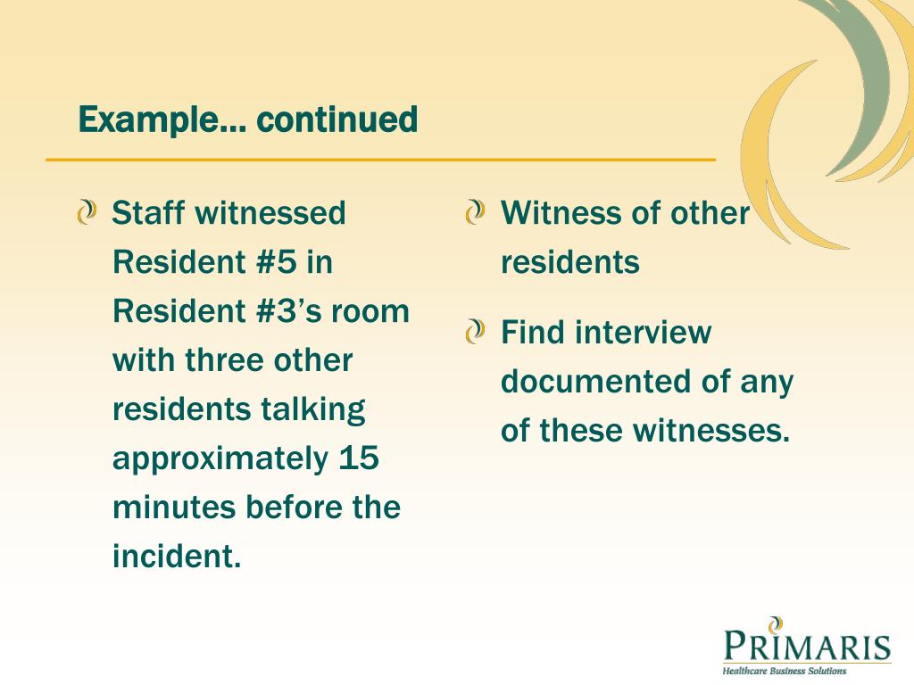 Example… continued • Staff witnessed Resident #5 in Resident #3’s room with three other residents talking approximately 15 minutes before the incident. • Witness of other residents • Find interview documented of any of these witnesses.